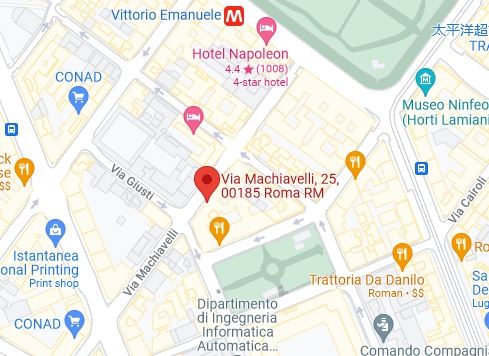 Sede di Roma: Via Machiavelli, 25 – Roma 00185 RM (Piazza Vittorio Emanuele II) raggiungibile con Metropolitana Linea A, uscita Manzoni o Piazza Vittorio Emanuele II,